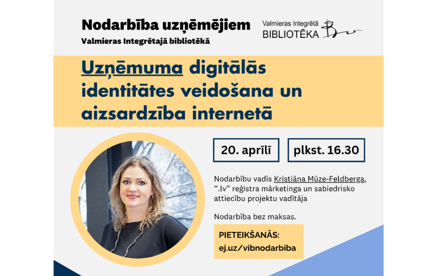 20. aprīlī plkst. 16.30 Valmieras Integrētajā bibliotēkā notiks bezmaksas nodarbība jaunajiem un pieredzējušajiem uzņēmējiem par uzņēmuma digitālās identitātes veidošanu un aizsardzību internetā.