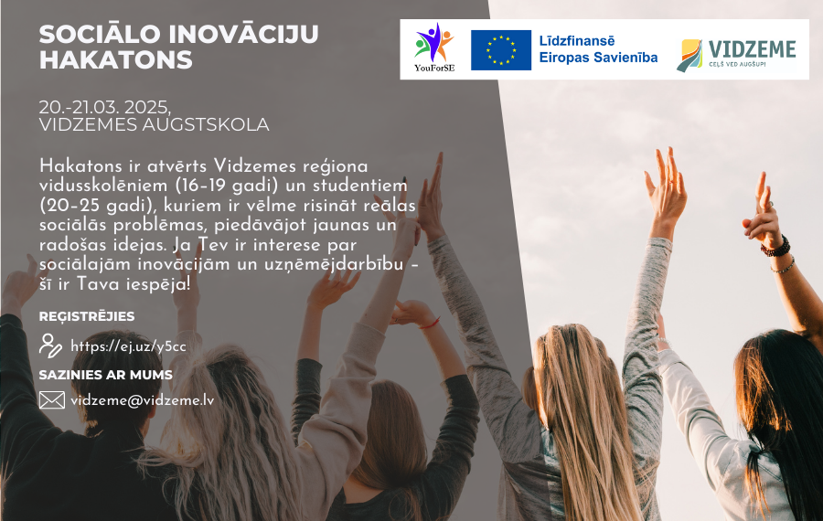 Sociālo inovāciju hakatonu Valmierā organizē Vidzemes plānošanas reģions projekta “Jaunieši – sociālās ekonomikas ekosistēmas pārmaiņu veicinātāji (YOUforSE)” ietvaros.