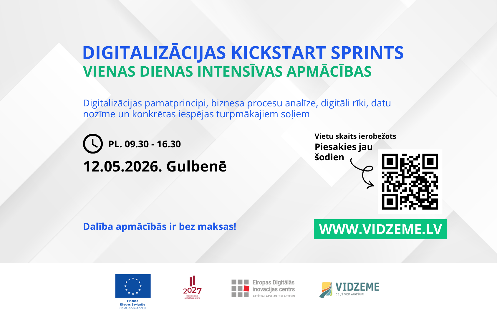 Dažādu jomu uzņēmēji un organizāciju pārstāvji Vidzemē aicināti pieteikties “Digitalizācijas Kickstart Sprint” mācībām, kas notiks 12. maijā Gulbenē. Intensīvā vienas dienas treniņā dalībnieki saņems informāciju par praktisku digitalizācijas procesa uzsākšanu.